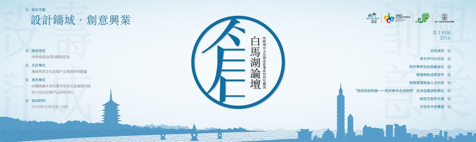 2016年10月22日,第十四届海峡两岸文化创意产业高校研究联盟论坛在杭州白马湖建国饭店召开。本届论坛由中华全国台湾同胞联谊会、中国宋庆龄基金会指导,中国传媒大学文化发展研究院与杭州市文化创意产业研究中心共同承办。多所高校、科研机构、行业协会及文化创意企业的百余位代表参加了此次论坛。 海峡两岸文化创意产业高校研究联盟立足于两岸高校的学术研究与实践交流合作,以务实的理论探讨、学术交流和政产学研对话为基础,开展一系列主题活动,旨在促进全球华人文化创意领域的跨界合作与交流。南京航空航天大学作为联盟成员之一,由国产直播