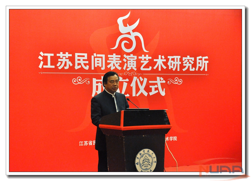 校长助理熊克教授在成立仪式上致欢迎词。他指出,江苏民间表演艺术研究所的成立,体现了南航对民间表演艺术与文化研究、非物质文化遗产保护等领域的高度关注,也是学术界及江苏省文化系统对我校在该领域所取成绩的充分肯定。它的成立有利于我校加强人文学科建设,进一步服务江苏文化建设。同时,也为各种民间传统文化艺术的交流提供平台,是一次双赢的合作。