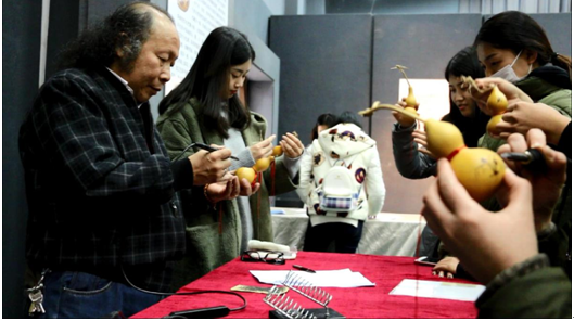 开幕式结束后,嘉宾和观众参观了烙画展。观展过程中,烙画传承人王高飞先生亲自为大家讲解烙画艺术,并邀请张捷院长共同参与制作“兰香四溢”烙画葫芦作品,观展的学生们也纷纷与王高飞先生互动,现场气氛非常热烈。