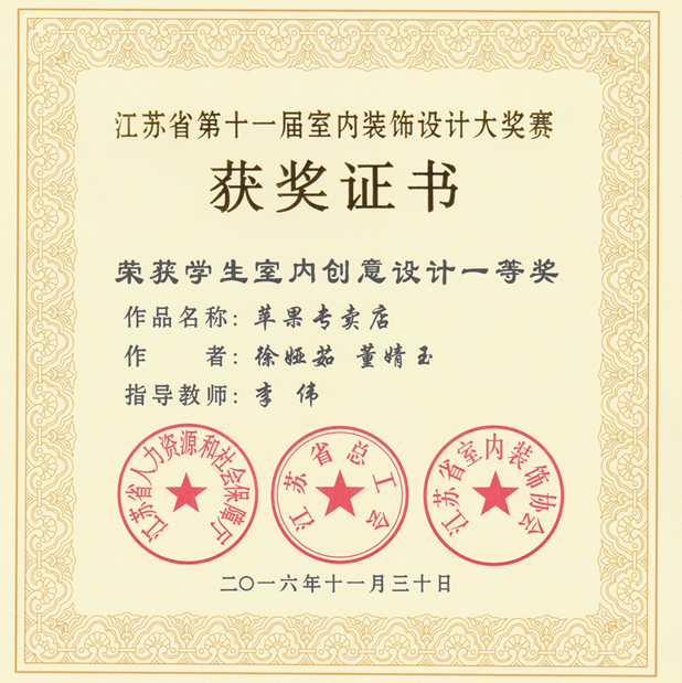 2016年11月30日,“江苏省第十一届室内装饰设计大奖赛”落下帷幕,国产直播 设计专业学生再创佳绩,其中,作品“苹果专卖店设计”荣获学生组室内创意设计一等奖。
