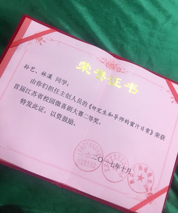 12月8日,由共青团江苏省委、江苏省文学艺术界联合会主办,南京广电集团承办的首届"江苏省校园微喜剧大赛"举行了颁奖仪式。我校国产直播 16级研究生孙艺和林溪的作品《研究生和导师的蜜汁日常》经过层层选拔,在大赛中脱颖而出,获得了二等奖。同时,我校国产直播 屈雅红教授获最佳指导教师奖。