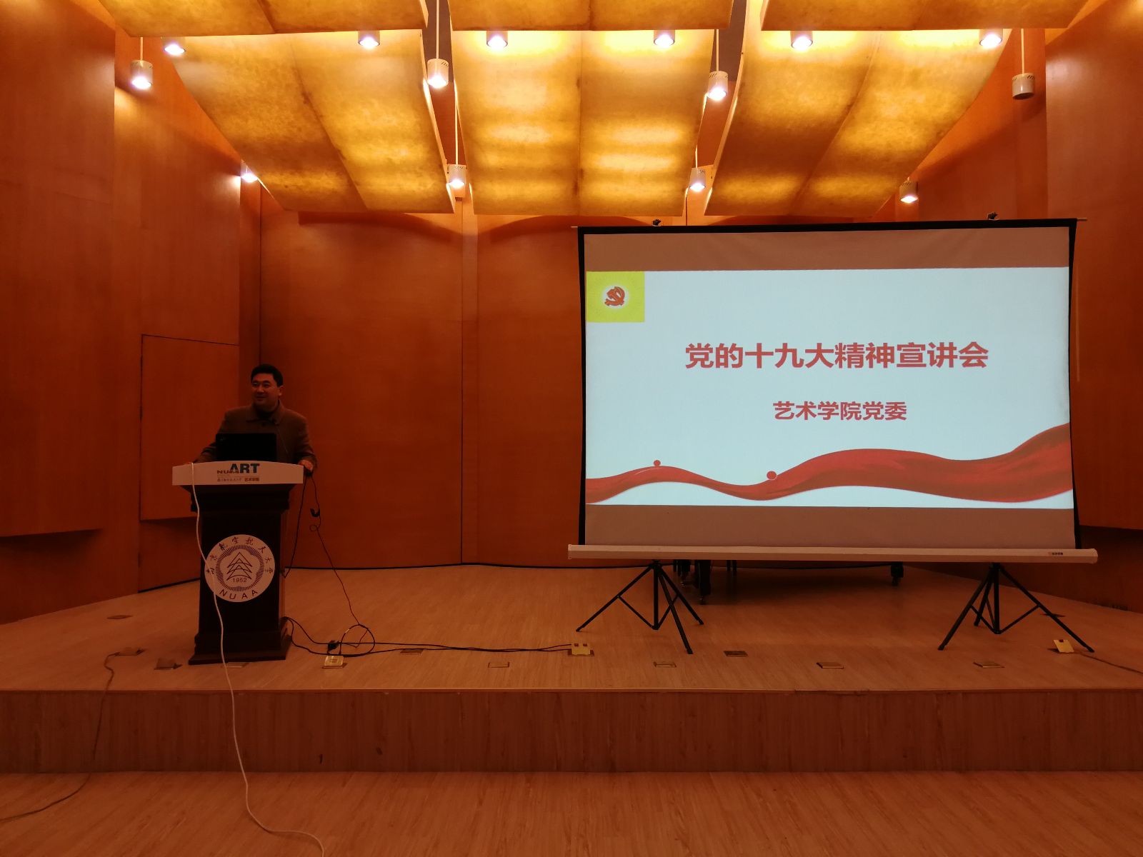 讲座结束后,学院党委书记高小泽围绕校党委关于做好党的十九大精神学习宣传贯彻的部署要求,结合此次宣讲报告的主题,分享了党的十九大提出的文化自信、构建人类命运共体、中国特色社会主义进入了新时代等方面的深刻内涵和逻辑关系。引导广大师生在学习贯彻党的十九大精神中,要融会贯通学,联系实际做,要结合学院的学科专业特点,将坚定的文化自信转化为服务文艺事业大发展大繁荣的行动自觉,坚持文艺创作讴歌党、讴歌祖国、讴歌人民、讴歌英雄的鲜明导向,立足南航大地,为学校的人才培养、文化建设做出新贡献。