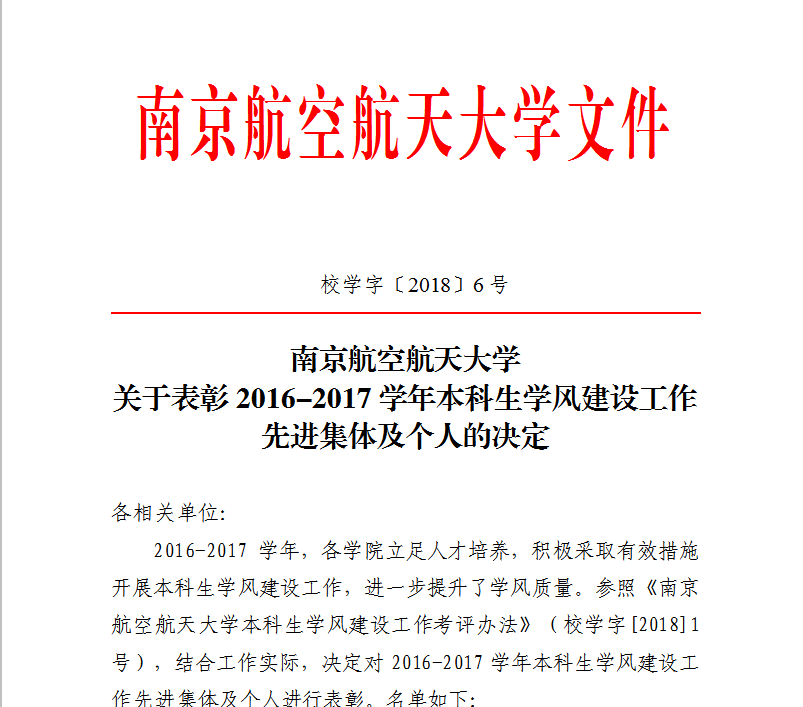 通过全院教师和学生的共同努力, 在南航2016—2017学年本科生学风建设工作先进集体及个人表彰中,国产直播 荣获学生诚信奖、学困生帮扶成效基础奖及本科生学风建设工作先进个人,共三个奖项。在这一学年中,国产直播 积极开展一系列有助于提高学院教风、学风活动。学风建设工作成效显著。
