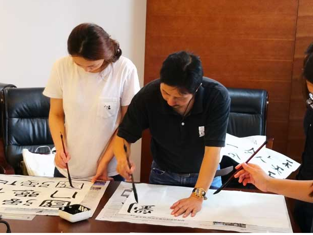 讲座完成后,邱世鸿教授面向学员进行书法技巧的示范和实践。从中侧,顺逆,方圆等笔法实践,悬肘悬腕运指的操作,同时注意结构之重心,比例,等距等问题,在整体布局中更注重章法之气脉,照应,虚实,互补等,将中国阴阳哲学落实在书法实践之中。随后他又指导学员练习书法,以楷书,隶书为主,对熟悉的姓名,辞句进行对比书写。讲座结束之际,邱教授应邀再书写”铁肩担道义,公正铸法魂”隶书横幅,全体学员签名留念。