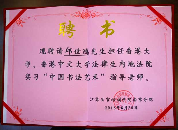 6月29日下午,受南京中级法院之邀请,邱世鸿教授在南京铁路运输法院大楼为香港大学、香港中文大学法学专业学生开展学术讲座,并进行书法示范与指导,获得好评。同时,被聘为港生在内地学习的指导教师。