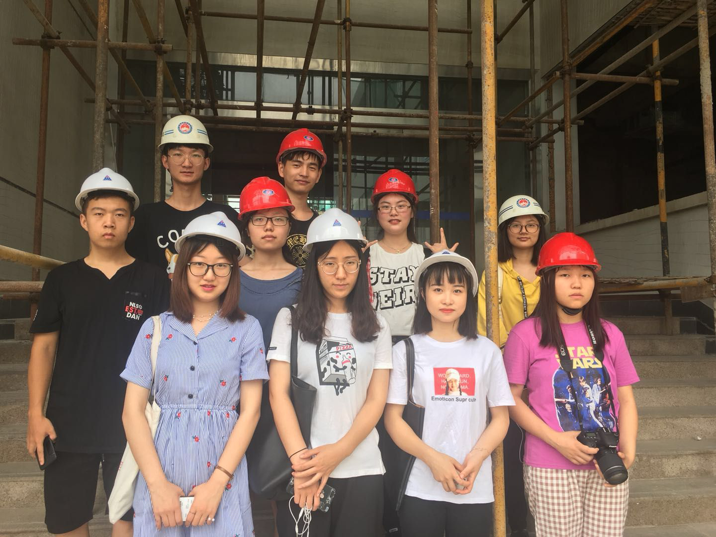 征得工地负责人的同意后,队员们戴上安全帽,在炎炎烈日下,兵分四路相继出发前往四所工地。工地里,机器声嗡嗡作响,工人们身穿工作服,头戴安全帽,到处都是他们忙碌的身影,有的蹲在地上,敲打着钢筋,有的站在高空的架子之上,目不转睛地忙活着,汗水湿透了衣服。