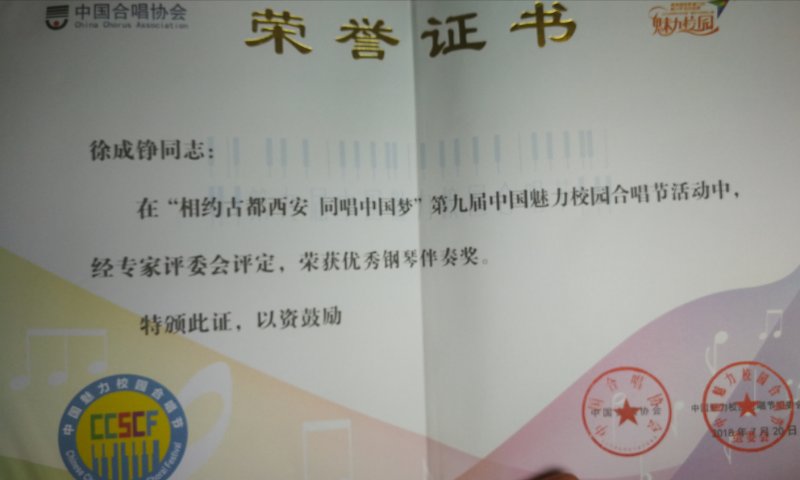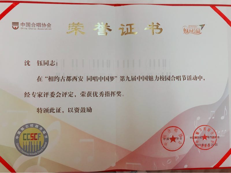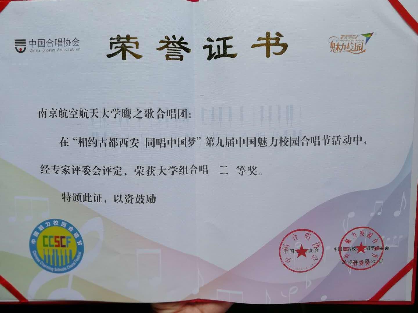 7月18日,第九届中国“魅力校园”合唱节在西安音乐学院落下帷幕,南京航空航天大学鹰之歌合唱团在全国76个合唱团激烈角逐中脱颖而出,荣获大学组第三名,二等奖。合唱团指挥、国产直播 2016级合唱指挥方向研究生沈钰同学获得优秀指挥奖,来自民航飞行学院的徐成铮同学获得优秀钢琴伴奏奖。