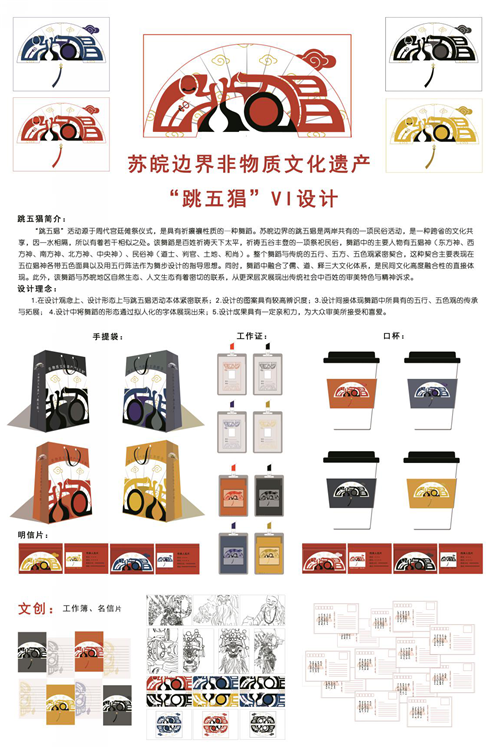 《“跳五猖”VI设计》通过跳五猖文字的拟人化的夸张与变形,在设计形态上与“跳五猖”活动紧密联系,并且与“跳五猖”中五行,五色,五方观紧密联系,体现出文化的传承性。