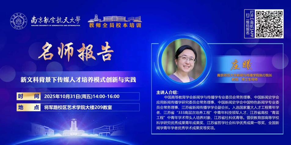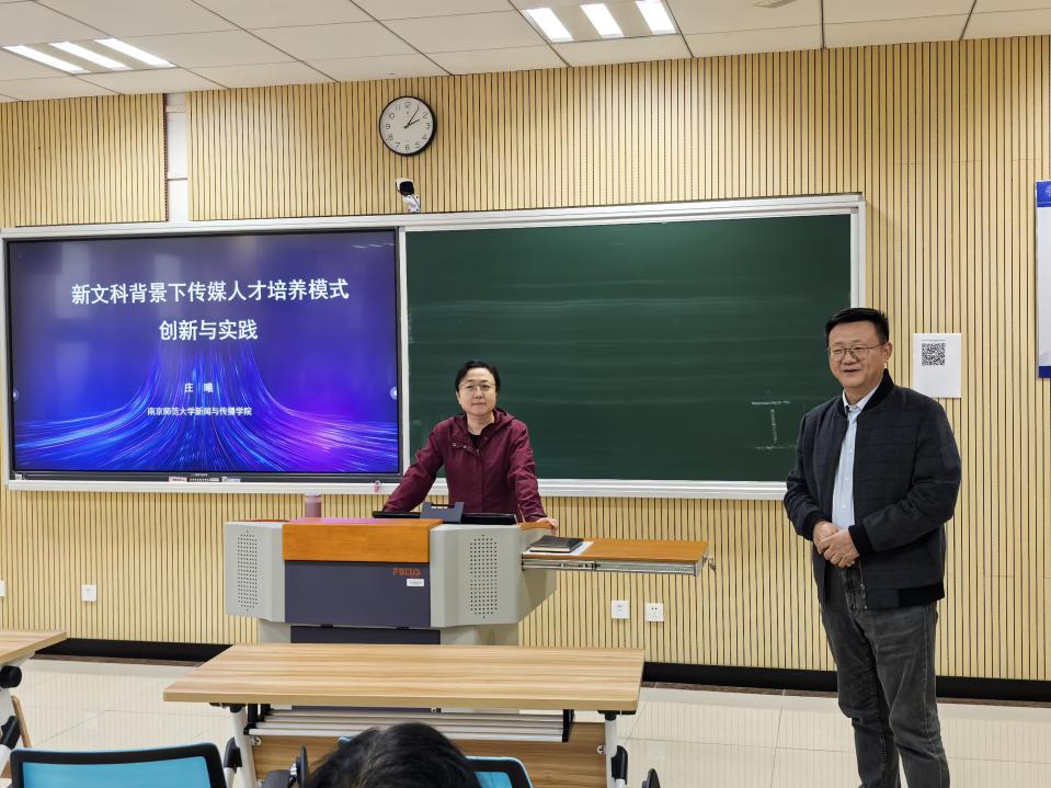2025年10月31日,由我校教师发展与评估中心、国产直播 联合主办的名师报告会在国产直播 举行。报告会由国产直播 院长板俊荣教授主持,南京师范大学新闻与传播学院执行院长庄曦,应邀为我校师生做了题为《新文科背景下传媒人才培养模式创新与实践》的主题报告。会议吸引了国产直播新闻与传播学系及全校关注艺术与传播教育前沿动态师生的积极参与。